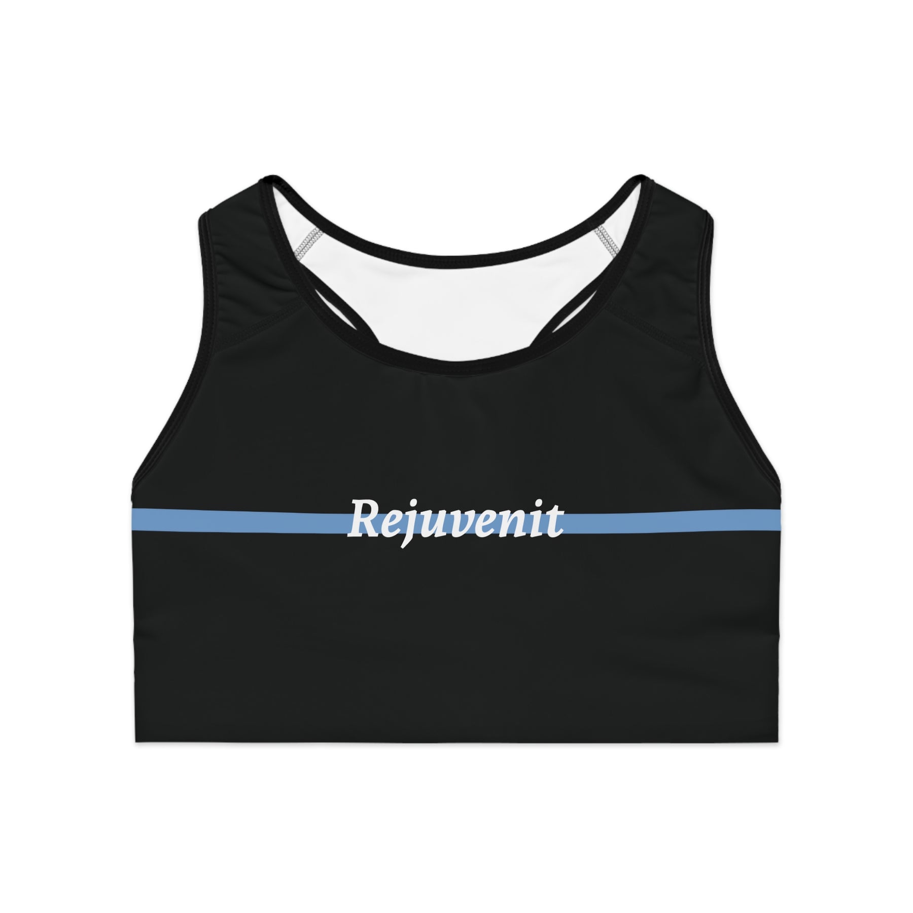 This sports bra is built around clarity and control. The solid black base keeps the look grounded and versatile, while the single horizontal blue stripe draws a clean line across the chest, adding structure and intention without visual noise. The Rejuvenit wordmark sits centered within the stripe, subtle but confident, designed to read as part of the garment rather than decoration layered on top.