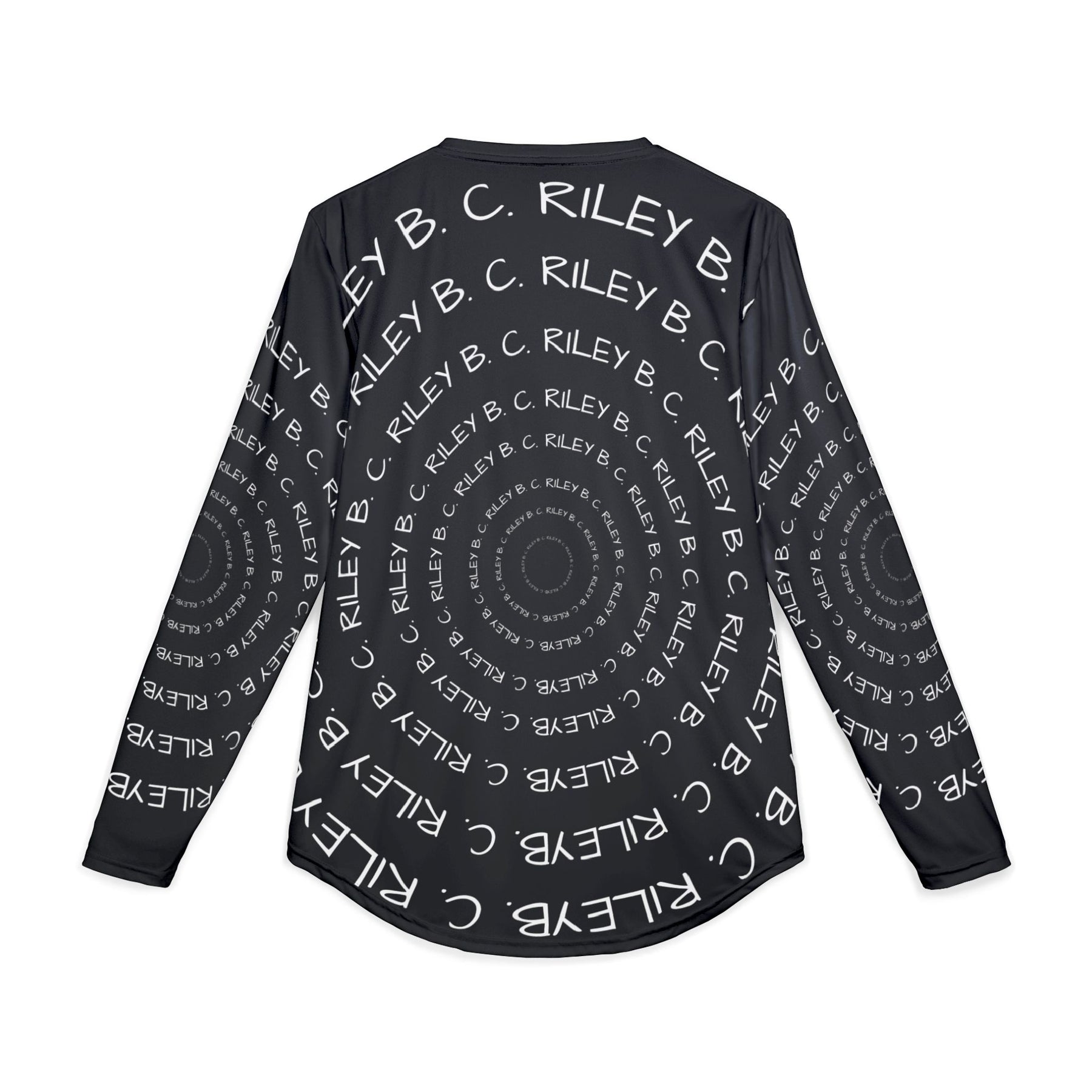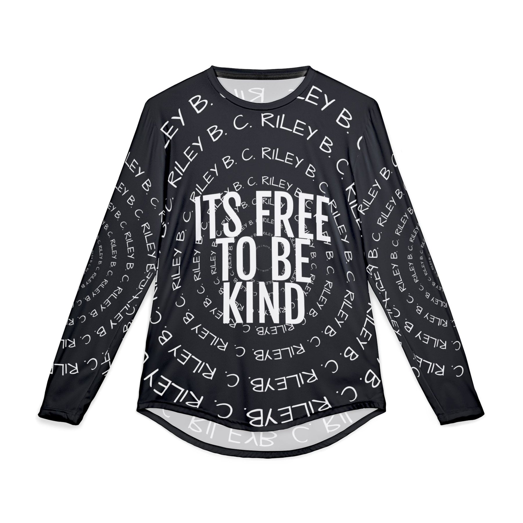 Set against a deep black base, the all-over B. C. Riley script forms a subtle circular motion that draws the eye inward. The layered typography creates depth without noise, allowing the central message ITS FREE TO BE KIND to stand firm and unmistakable. In black, the statement feels grounded, calm, and deliberate. Not loud. Not performative. Just true.